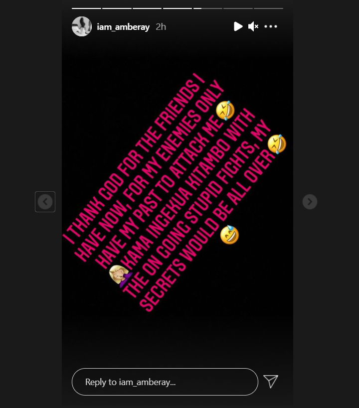 “I thank God for the friends I have now, for my enemies only have my past to attack me…kama ingekuwa kitambo with the ongoing stupid fights my secrets would be all over”