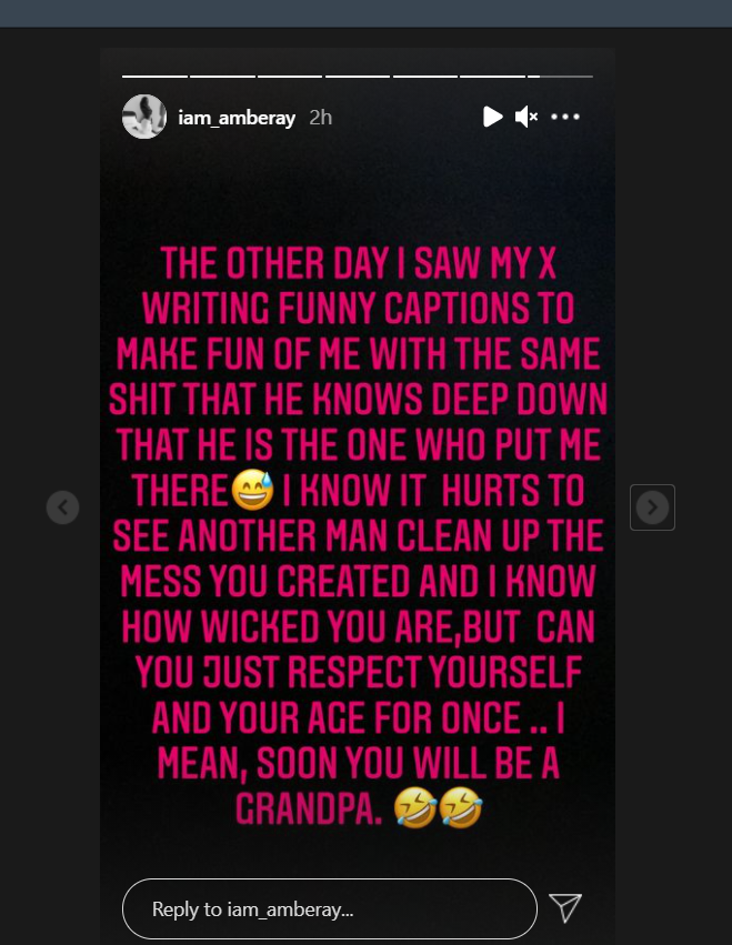 “The other day I saw a my X writing funny Captions to make fun of me with the same shit that he knows deep down that he is the one who put me there…I know it hurts to see another man clean up the mess you created and I know how wicked you are, but can you just respect yourself and your age for once…I mean soon you will be a grandpa,” lamented Amber Ray.