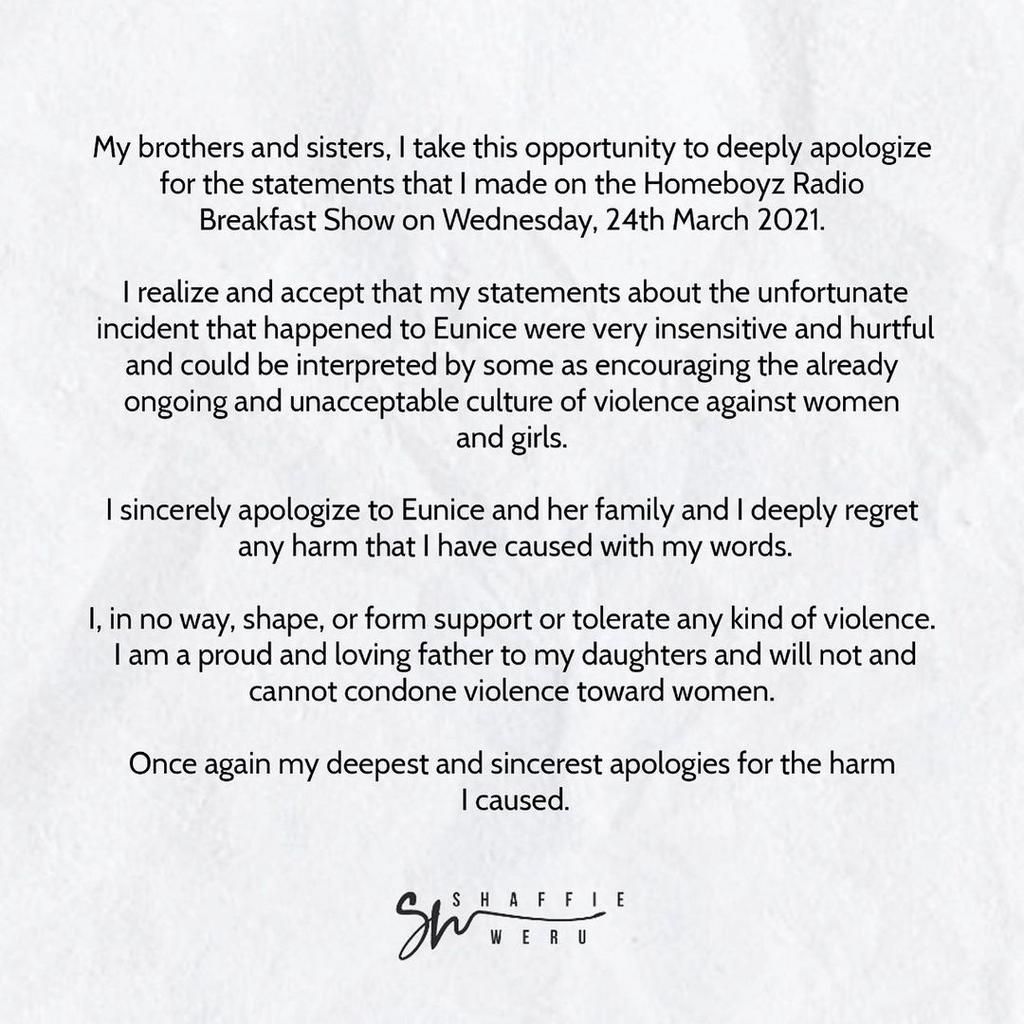 I sincerely apologize to Eunice and her family and I deeply regret any harm that I have caused with my words” reads part of Shaffie’s apology.