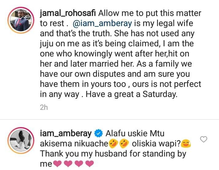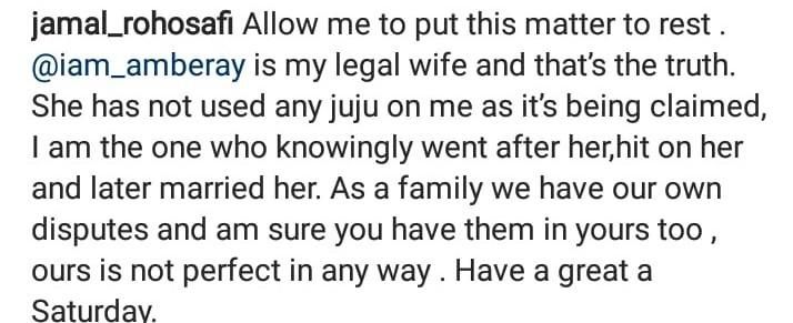 “Allow me to put this matter to rest. Amber Ray is my legal wife and that’s the truth. She has not used any juju on me as it’s being claimed. I am the one who knowingly went after her, hit on her and later married her,” wrote Jamal.