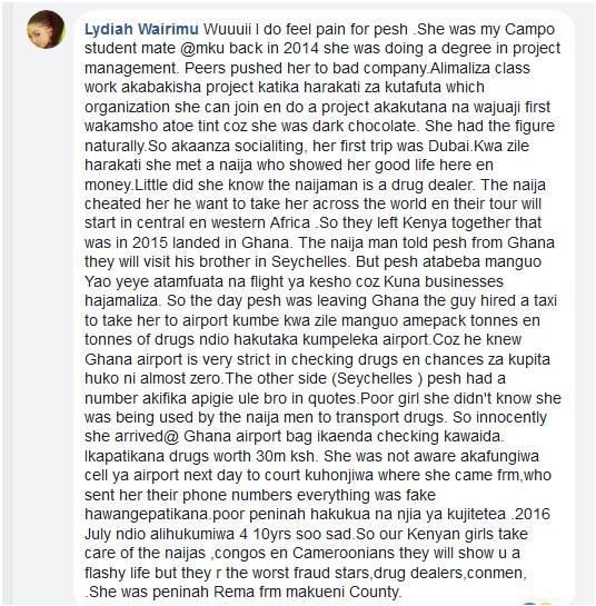 “Poor girl she didn’t know she was being used by the naija men to transport drugs. So innocently she arrived@ Ghana airport bag kaenda checking kawaida. ikapatikana drugs worth 30m ksh. She was not aware akafungiwa cell ya airport next day to court kuhonjiwa where she came from, who sent her their phone numbers everything was fake hawangepatikana.” Lydia added.