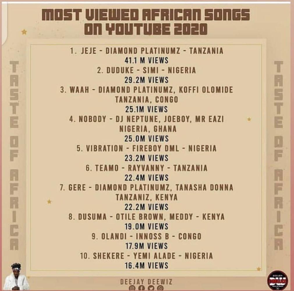 - Jeje - Diamond Platnumz –Tanzania (41.2 M views)
