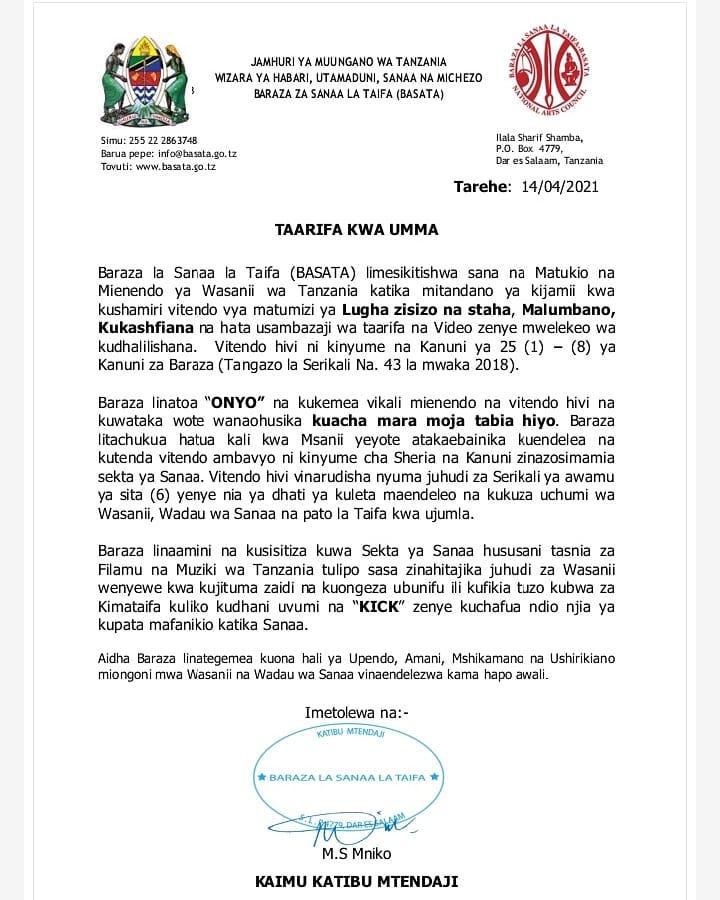 “Baaza la Sanaa La Taiafa (BASATA) limesikitishwa sana na matukio na miendo ya Wasanii wa Tanzania katika mitandaoni ya kijamii kwa kushamiri n ahata usambazaji wa taarifa na video zenye mwelekeo was kudhalilisha. Vitendo hivi ni kinyume na Kanunu ya 25 (1) – (8) ya kanunu za Baraza (Tangazo la serekali Na.43 la mwaka 2018).