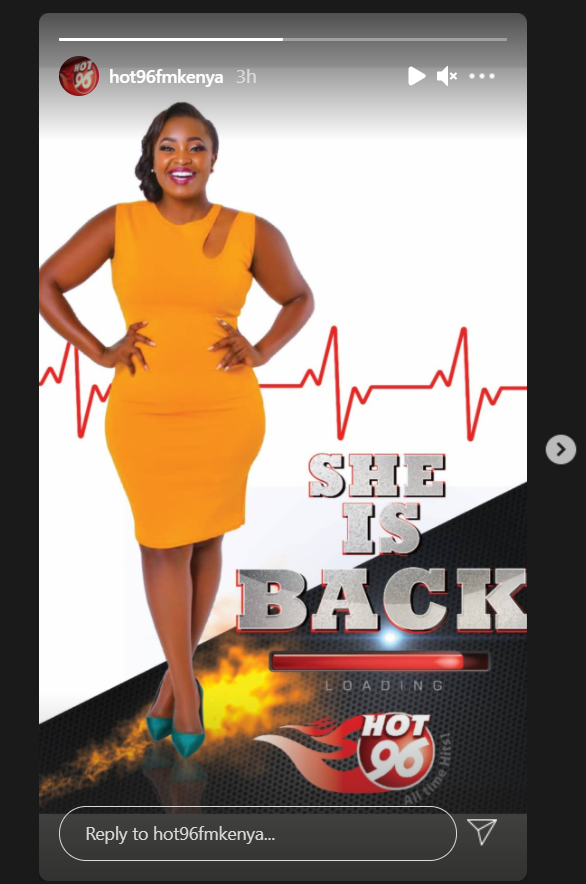 "Hey! So it's out I am back with my @hot96fmkenya Fam and I couldn't be more excited. Thank you for always supporting me and see you on Monday alongside @willisraburu 10 am -1 pm on the Rhythm Junction" shared Terry Muikamba.