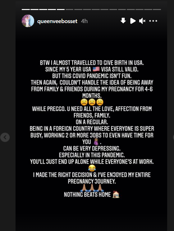 “I almost travelled to give birth in USA. Since my 5 years Visa is valid. But this Covid pandemic isn’t fun. Then again, we couldn’t handle the idea of being Away from family and friends during my pregnancy for 4-6 months.