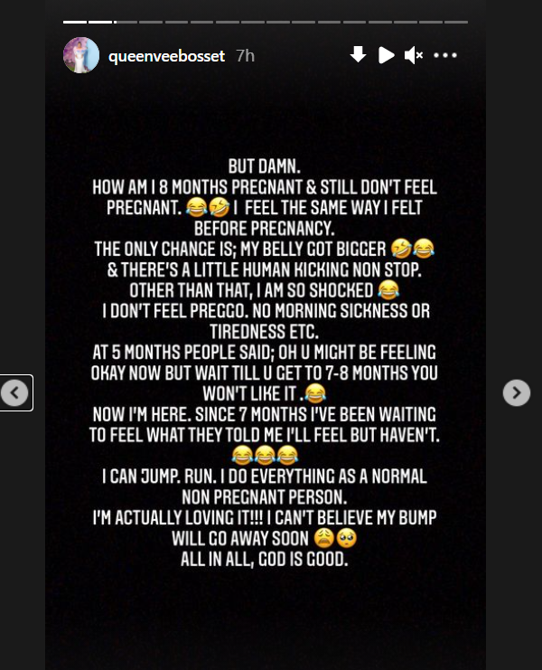 “How I’m 8 months pregnant and still don’t feel pregnant, I feel the same way I felt before pregnancy. The Only change is; my belly got bigger and theres a little human kicking nonstop other than that, I am so shocked. I don’t feel pregnant. No morning sickness or tiredness. At 5 months’ people said; oh you might be feeling okay now but wait till I get to 7-8 months you won’t like it.