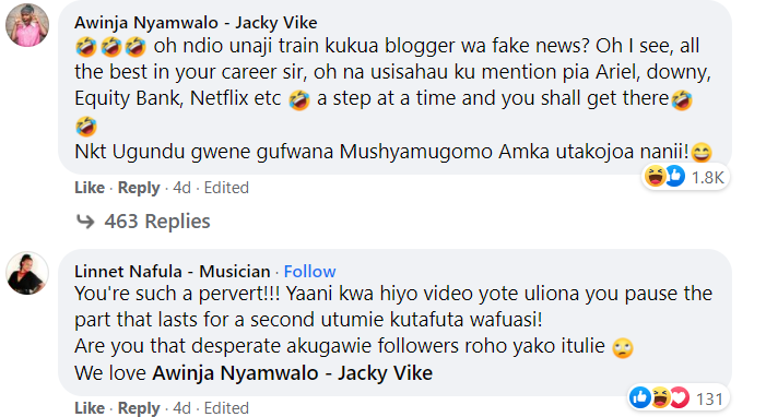 Linnet Nafula - Musician “You're such a pervert!!! Yaani kwa hiyo video yote uliona you pause the part that lasts for a second utumie kutafuta wafuasi! Are you that desperate akugawie followers roho yako itulie. We love Awinja Nyamwalo - Jacky Vike”