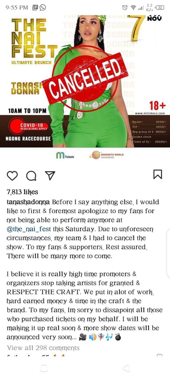 I believe it is really high time promoters & organizers stop taking artistes for granted & RESPECT THE CRAFT. We put in a lot of work, hard earned money & time in the craft & the brand. To my fans, I’m sorry to disappoint all those who purchased tickets on my behalf. I will be making it up real soon & more show dates will be announced very soon..” said Tanasha Donna in a post she has since deleted.