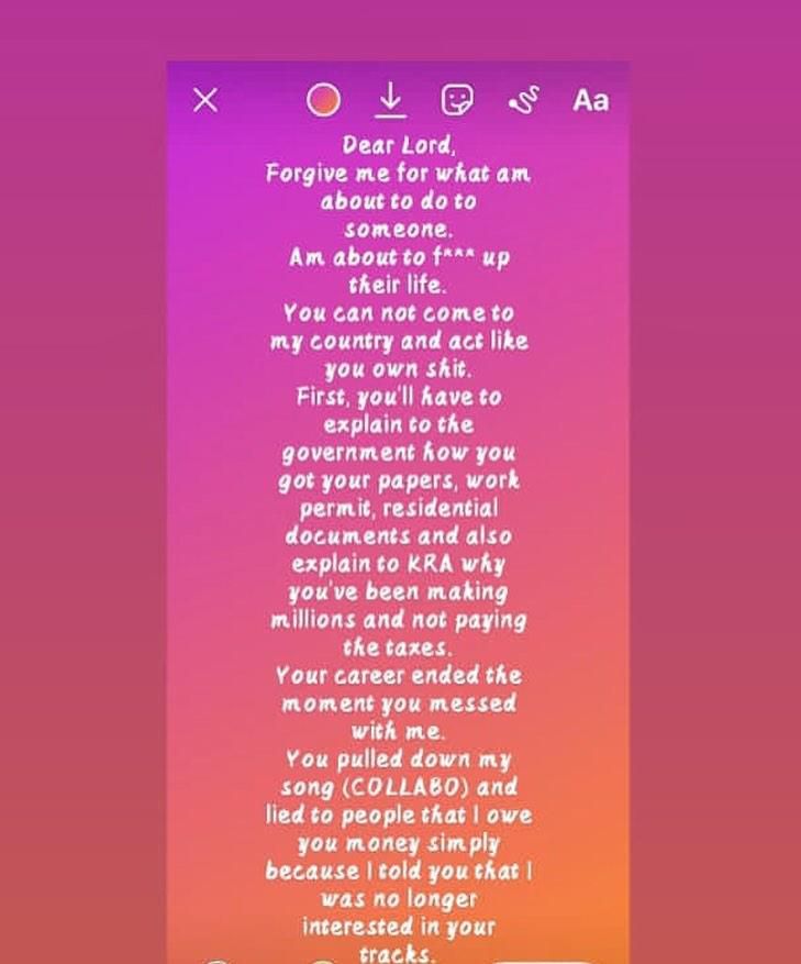 “Dear Lord, forgive me for what I’m about to do to someone. Am about to f*** up their life. You cannot come to my country and act like you own shit. First, you’ll have to explain to the government how you got your papers, work permit, residential documents and also explain to KRA why you’ve been making million s and not paying the taxes. Your career ended the day you messed with me. You pulled down my song (COLLABO) and lied to people that I owe you money simply because I told you that I was no longer interested in your tracks,” said Willy Paul.