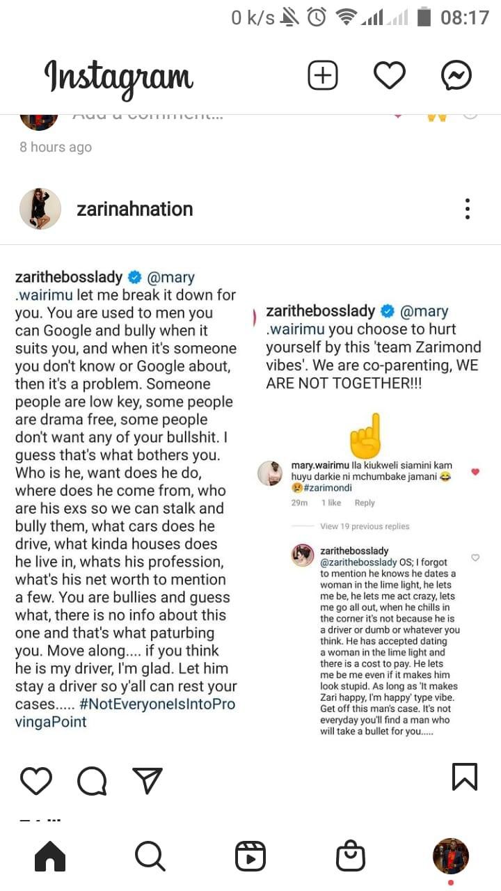 In an Instagram post, Zari was responding to a social media user identified as Mary Wairimu who claimed that Zari and Dark Stallion were no longer an item.