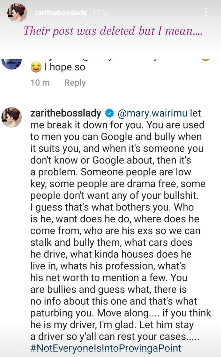 She retorted saying, “Let me break it down for you. You are used to men you can Google and bully when it suits you, when it’s someone you don’t know or google about then it’s a problem. Some people are low-key, some people are drama free, some people don’t want any of your bullshit. I guess that bothers you. Who is he. What does he do. Where does e come from. Who are his exes. So we can stalk and bully them., what car does he drive, what kinda houses does he live in, what’s his profession, what’s his name worth to mention a few. You are bullies and guess what, there’s no info about this one and that’s what perturbing you. Move along, if you think he is my driver, I’m glad. Let him stay a driver so y’all can rest your cases. #NotEveryoneisIntoProvingAPoint.”