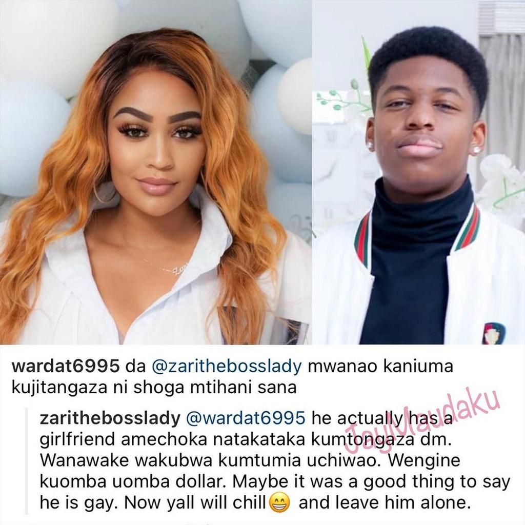 Zari replied “…He actually has a girlfriend amechoka na takataka kumtongoza Dm. Wanawake wakubwa kumtumia uchi wao. Wengine kuomba omba Dollar. Maybe it was a good thing to say he is Gay. Now you all will chill and leave him alone".