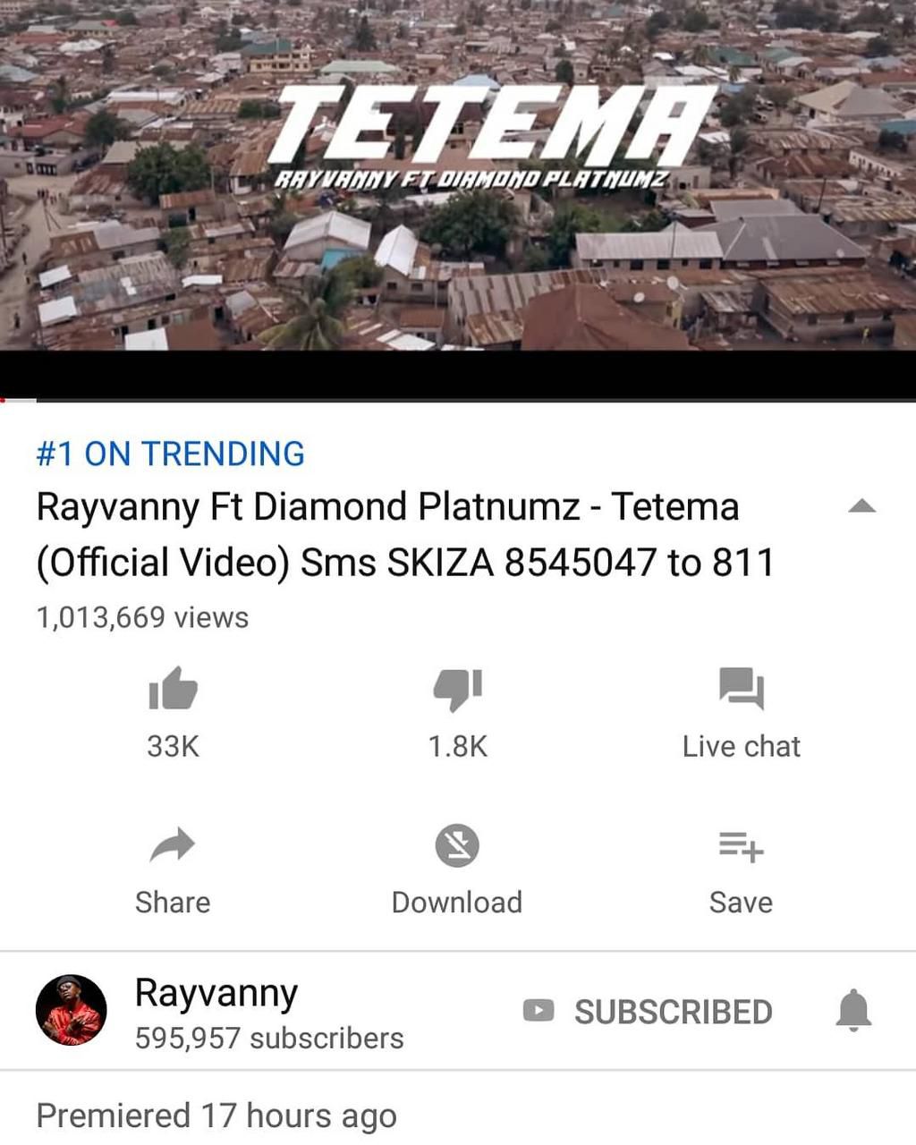 WCB Wasafi President Diamond Platnumz and his signee Rayvanny have set a new record in the Entertainment Industry after their new song “Tetema” garnered over 1 million views in 17 hours.