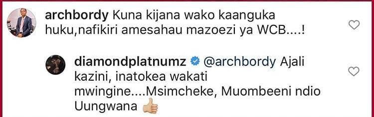 “@archbody Ajali kazini, inatokea wakati mwingine…. Msimcheke, Muombeeni ndio Uungwana,” said Diamond Platnumz.