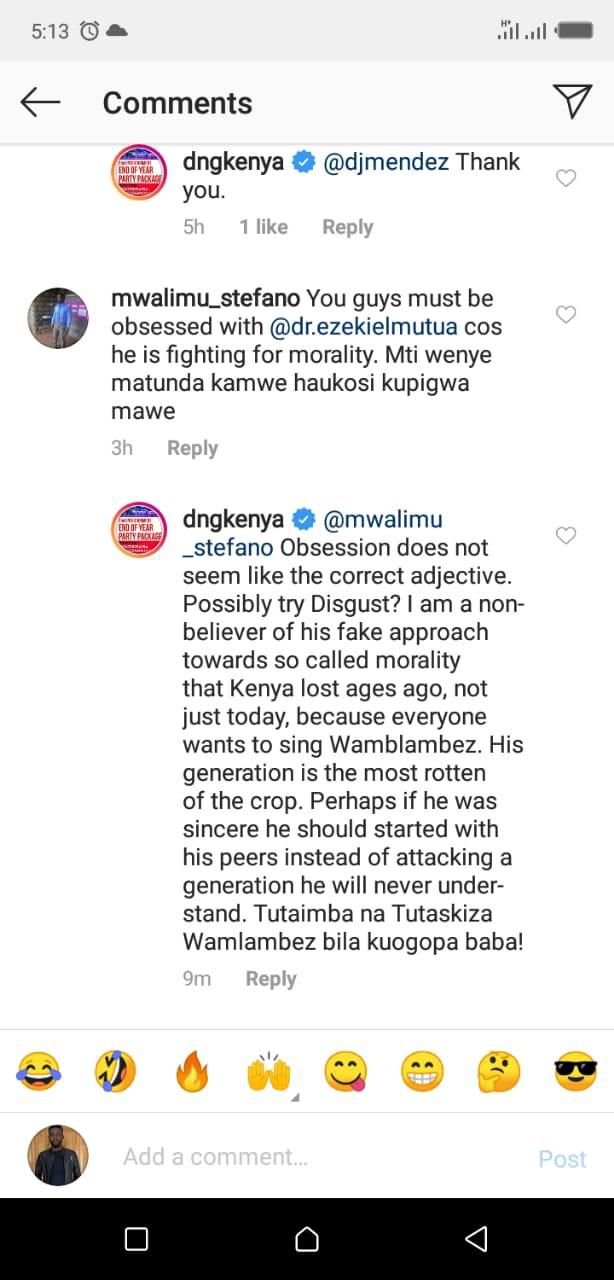A fan going by the name Mwalimu Stefano then accused DNG of being obsessed with the moral cop (Mutua), because he is only fighting for good morals.