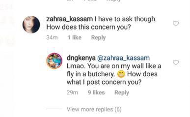 DNG added that Zahraa Kassam was on his wall like a fly in a butchery. “Lmao. You are on my wall like a fly in a butchery. How does what I post concern you,” said DNG.