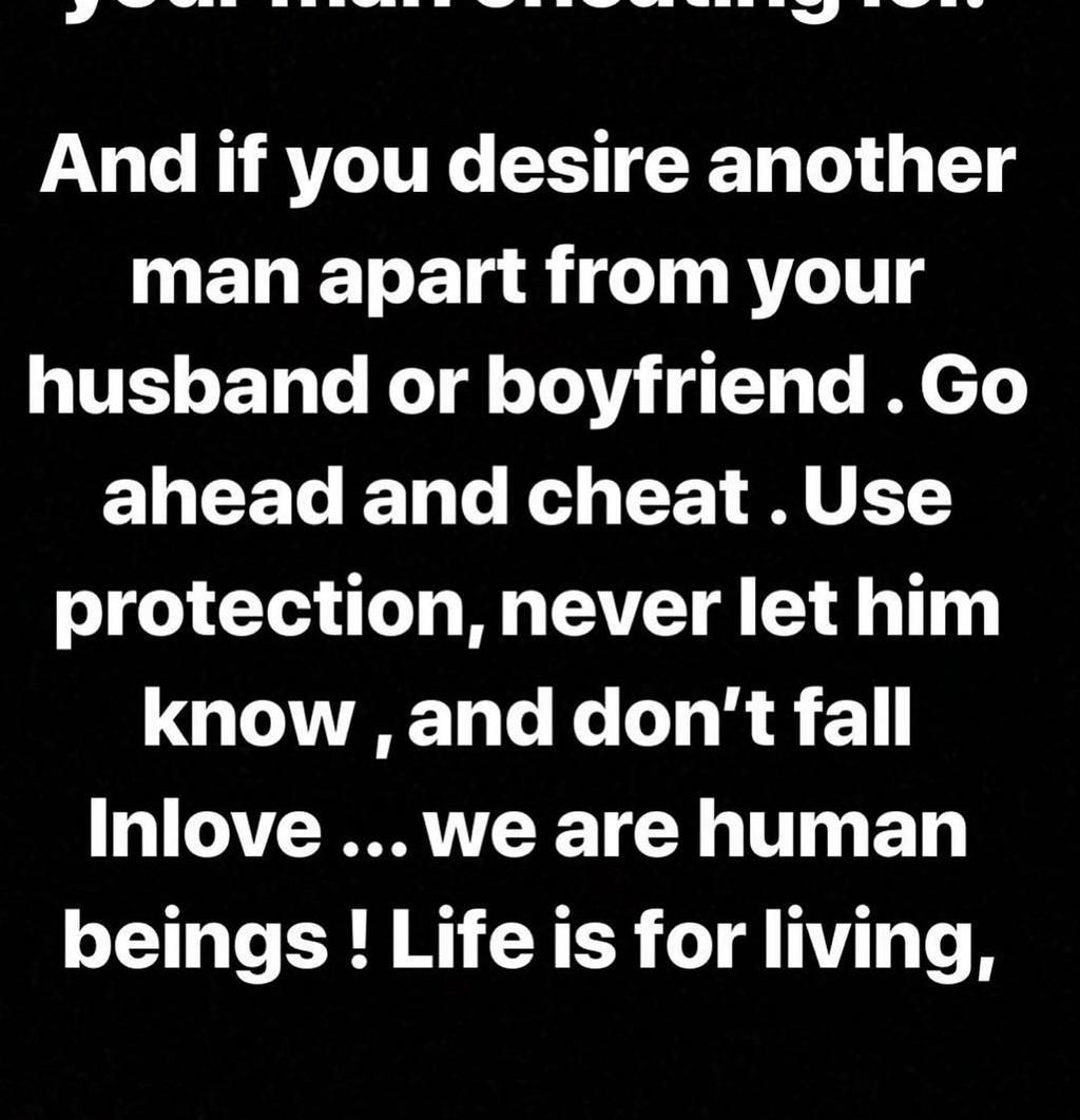 “Let them play as long as he doesn’t get babies outside or disease, and if he is cheating and he is broke leave him he soulsd cheat and put his brain to work. And also women, keep yourselves busy. Don’t be a house wife. Be a busy woman and you will have no time to think of your man cheating lol”