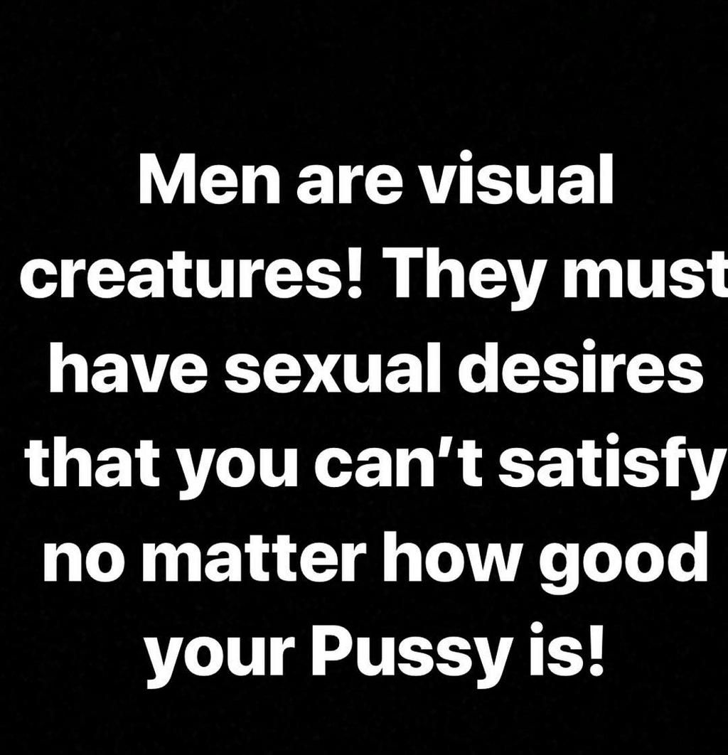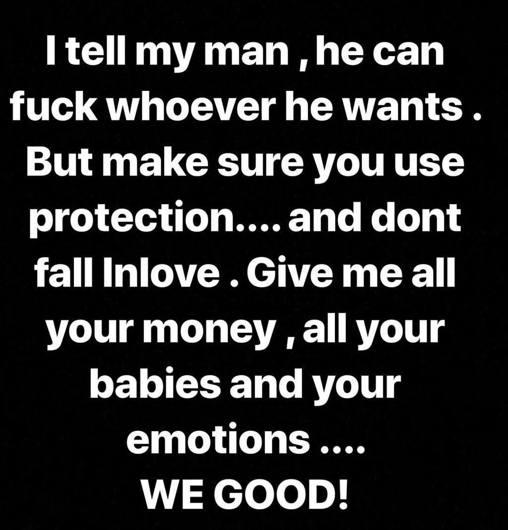 “I tell my man, he can fuck whoever he wants. But make sure you use protection …and don’t fall in love. Give me all your babies and your emotions. We good. Men are visuals creatures! They must have sexual desires that you can’t satisfy no matter how good is your pussy is".
