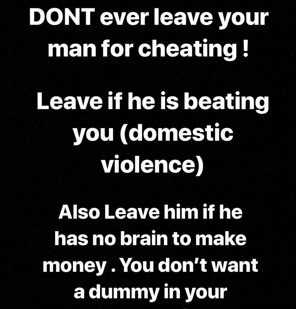 “Don’t ever leave your man for cheating. Leave if he beating you (Domestic violence) also leave him if he has no brain to make money. You don’t want a dummy in your life” shared Huddah.