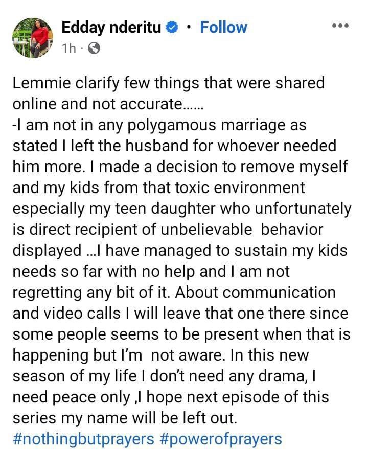 “Lemmie clarify few things that were shared online and not accurate…I am not in any polygamous marriage as stated I left the husband for whoever needed him more. I made a decision to remove myself and my kids from that toxic environment especially my teen daughter who unfortunately is direct recipient of unbelievable behavior displayed” Edday wrote on Facebook.