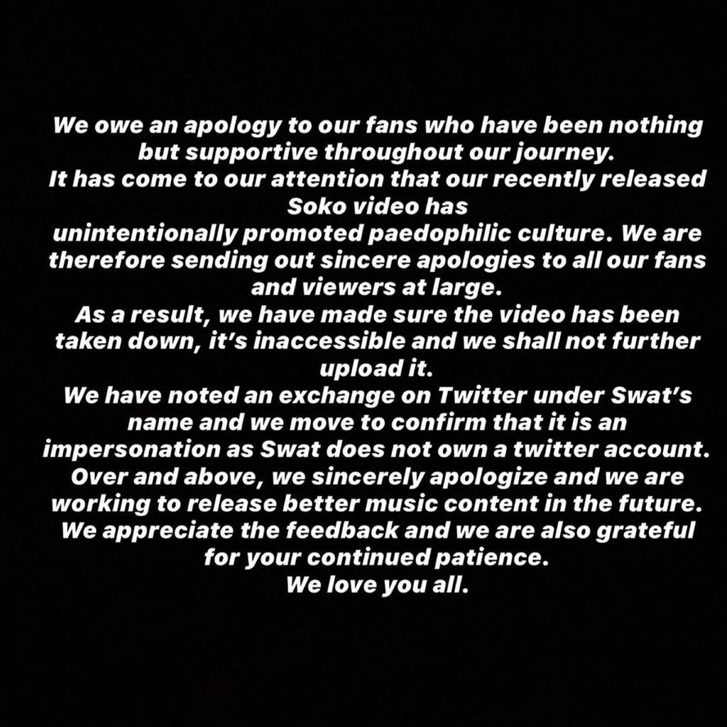 In their apology, the Figa hit-makers owned up to their mistake saying they unintentionally promoted Paedophilic culture with their 'Soko' song.