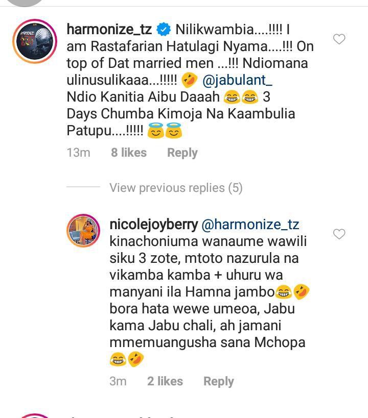 “Nilikwambia…!!!! I am Rstafarian Hatulagi Nyama…!!! On top of Dat married men…!!! Ndiomana..!!! @jabulant_ Ndio Kanitia Aibu Daaah 3 Days Chumba Kimoja na Kaambulia Patupu…!!!!” wrote Harmonize.