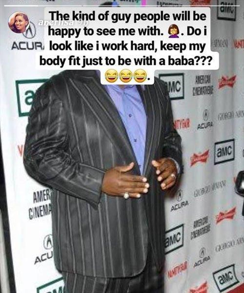 While the gossip raged on, Anerlisa took to Instagram to share a photo of a hefty man in a suit and wrote “The kind of guy people will be happy to see me with. Do I look like I work hard, keep my body fit just to be with a baba?”
