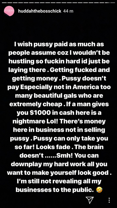 “I wish p*ssy paid as much as people assume because I wouldn’t be hustling so f*cking hard, I would just be laying there. Getting f*cked and getting money. P*ssy doesn’t pay especially not in America. Too many beautiful girls who are extremely cheap. If a man gives you $1000 in cash here is a nightmare LOL. There is money here in business not selling p*ssy. P*ssy can only take you so far. Looks fade the brain doesn’t,” Huddah wrote.
