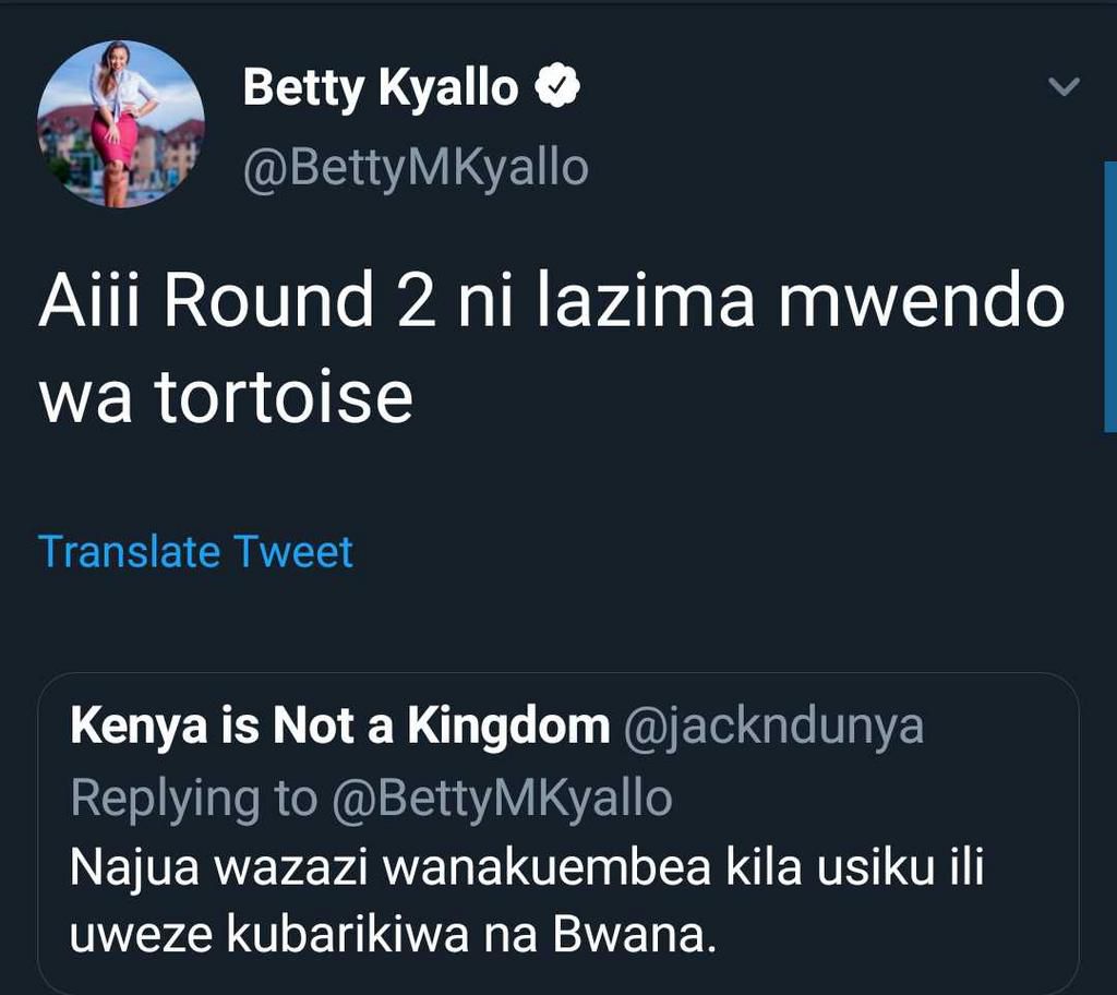 “Najua wazazi wanakuombea kila usiku ili uweze kubarikiwa na bwana,” the fan comment and Betty replied with “Aiii round 2 ni lazima mwendo wa tortoise.”