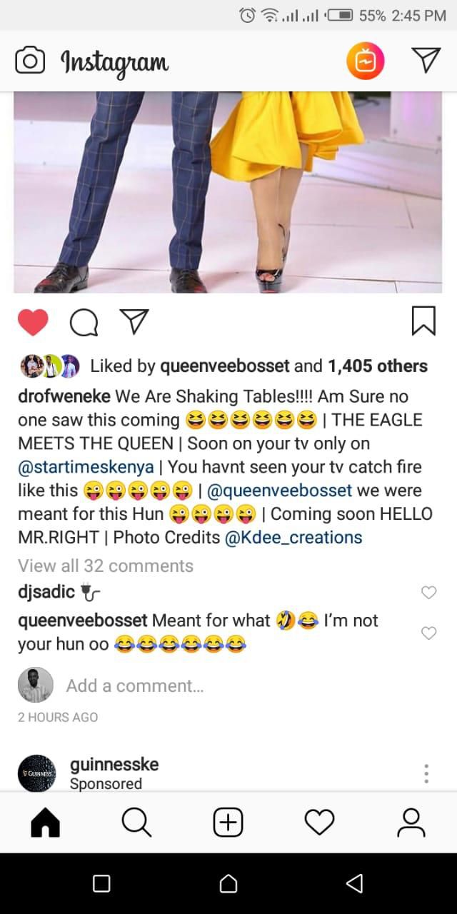 “We Are Sahking Tables!!!! I’m Sure no one saw this one coming. THE EAGLE MEETS THE QUEEN. Soon on your TV only on @Startimeskenya. You haven’t seen your TV catch fire like this @queenveebosset we were meant for this Hun. Coming soon HELLO NR. RIGHT,” wrote Ofweneke.