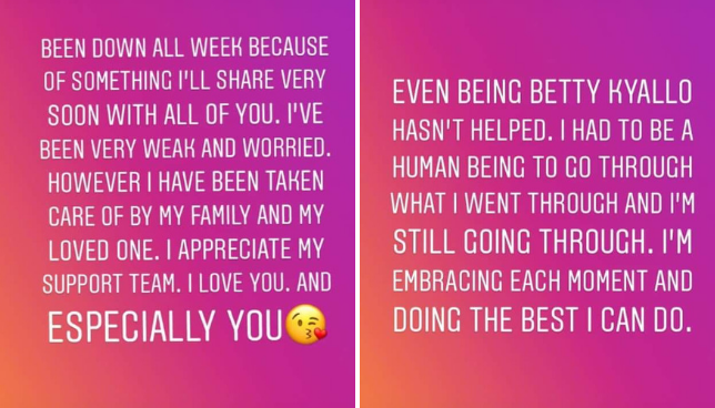 “Been down all week because of something I’ll share very soon with all of you. I’ve been very weak and worried. However, I have been taken care of by my family and my loved one. I appreciate my support team. I love you and especially you. Even being Betty Kyallo hasn’t helped. I had to be a human being to go through what I went through and I’m still going through. I am embracing each moment and doing the best I can do. I am as human as you are even though I am Betty Kyallo. I am a mum, a daughter, a sister. I’ll share with you my most trying times that I am still going through soon,” she said in a number of posts.
