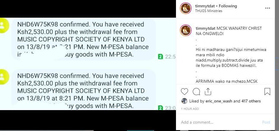 “MCSK Siku Moja Tutakuja Kuwavuruga uko Mbaya Sana, Msijaribu kunitumia izi peanuts tena, Infact I have given Authorization for my Music to be pirated, Don’t collect money on my Behalf anymore, Nisiskie mmeshika mtu akicheza Wimbo zangu kwa street, msinitumie izo peanuts zenu tena, The OG shall be respected #mrinternational”.