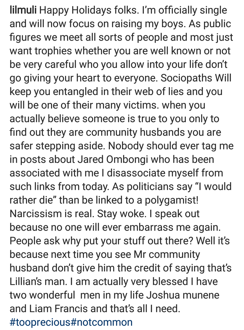 "Happy Holidays folks. I’m officially single and will now focus on raising my boys. As public figures we meet all sorts of people and most just want trophies whether you are well known or not be very careful who you allow into your life don’t go giving your heart to everyone. Sociopaths will keep you entangled in their web of lies and you will be one of their many victims. when you actually believe someone is true to you only to find out they are community husbands you are safer stepping aside. Nobody should ever tag me in posts about Jared Ombongi who has been associated with me I disassociate myself from such links from today. As politicians say “I would rather die” than be linked to a polygamist! Narcissism is real. Stay woke. I speak out because no one will ever embarrass me again. People ask why put your stuff out there? Well it’s because next time you see Mr community husband don’t give him the credit of saying that’s Lillian’s man. I am actually very blessed I have two wonderful men in my life Joshua munene and Liam Francis and that’s all I need. #tooprecious#notcommon" read her post.