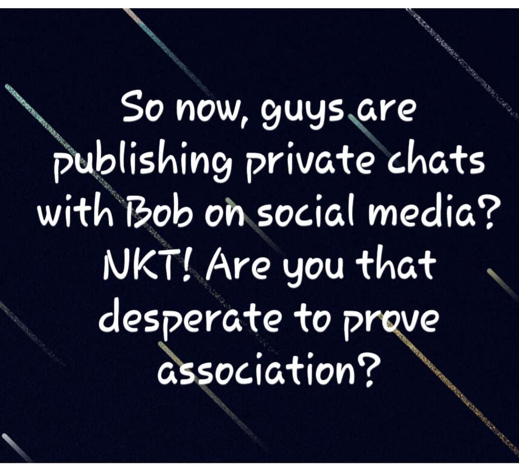 “So now guys are publishing private chats with Bob on Social media? NKT! Are you desperate to prove association? It was private,” Reads Massawe’s post.