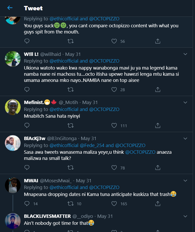 This comes days after Octopizzo threw shade at them, for saying Khaligraph Jones is greater than him in one of their tweets.