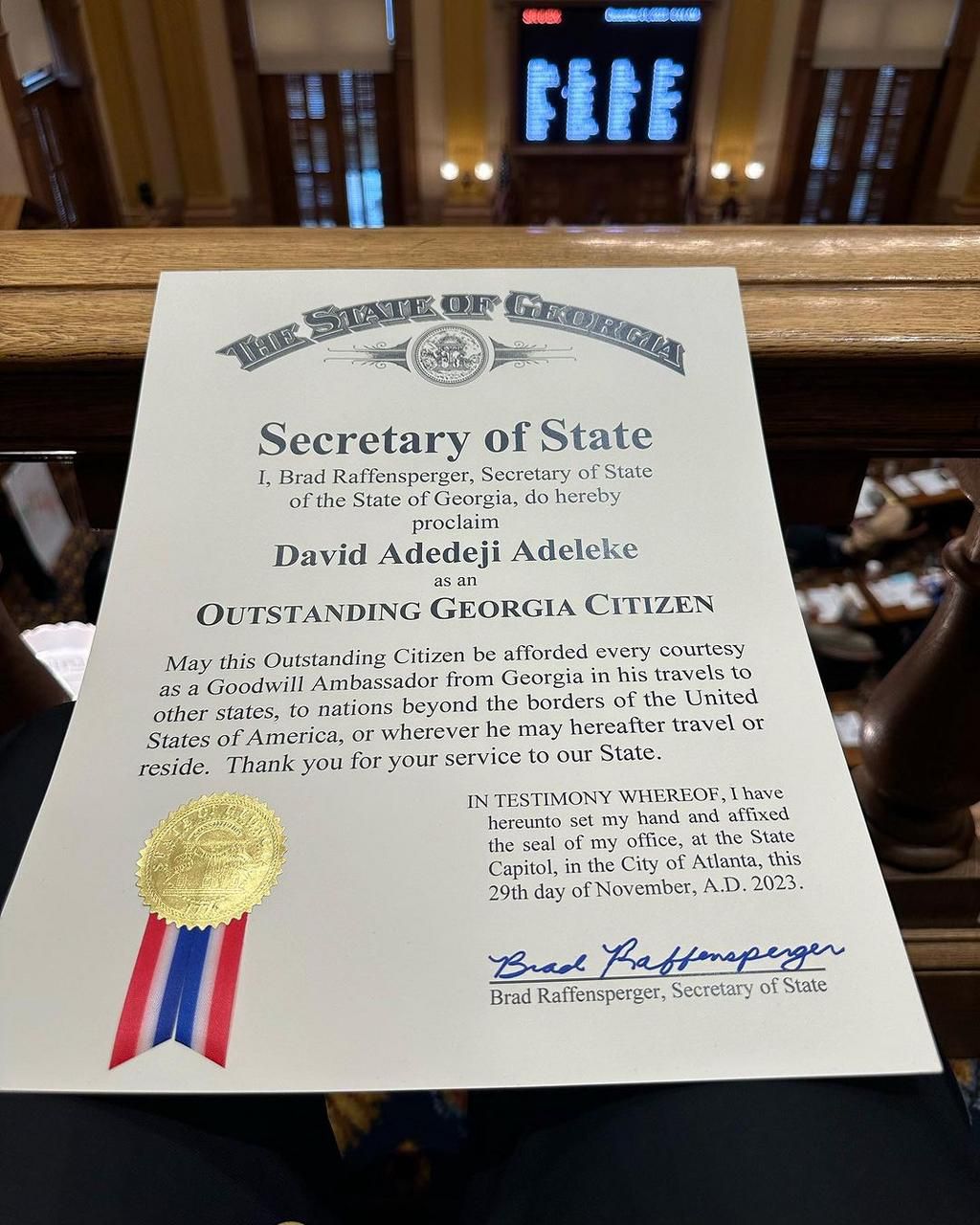 Nigerian singer Davido recognized as an outstanding Georgia citizen.