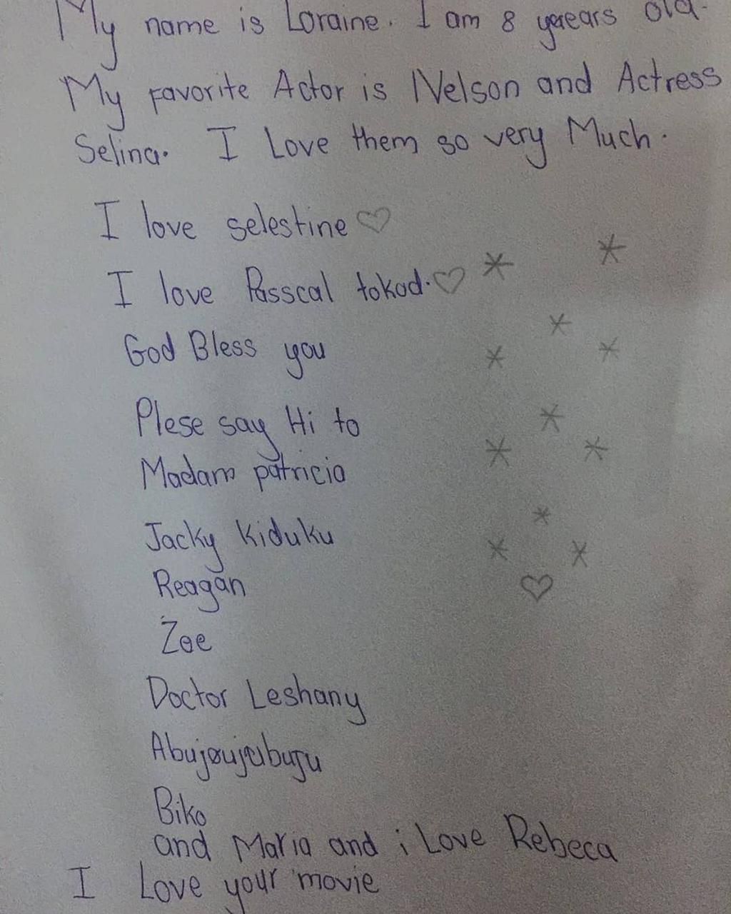 In the letter, the 8-year old wrote this: “My name is Loraine. I am 8 years old. My favorite Actor is nelson and Actress is Selina. I love them so much. I love Selestine. I love Passcal Tokodi God bless you,”