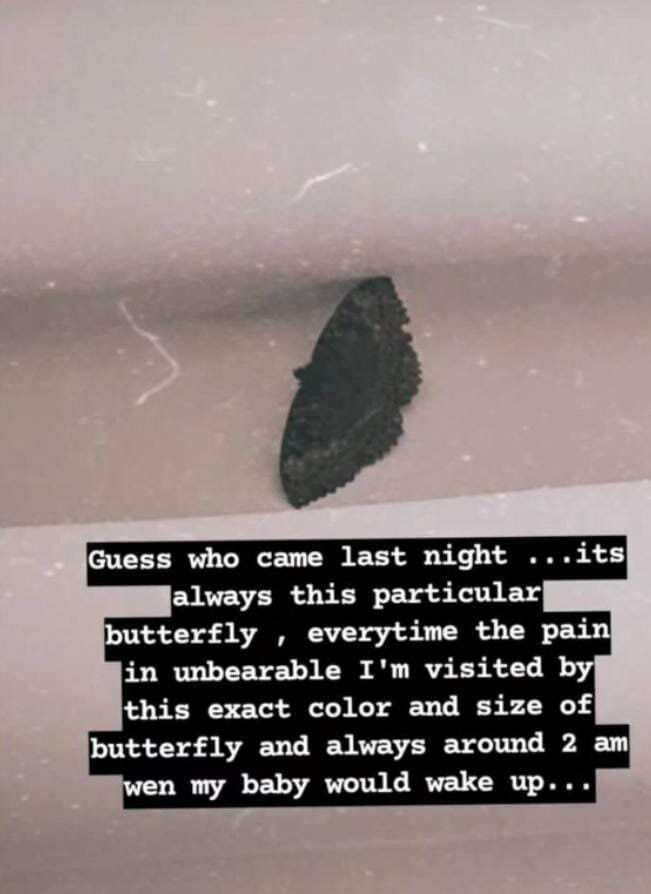 “Guess who came last night… its always this particular butterfly, every time the pain is unbearable I’m visited by this exact color and size of butterfly and always around 2 am when my baby would wake up,” Nazizi wrote in a post on InstaStories on Friday September 27, 2024.