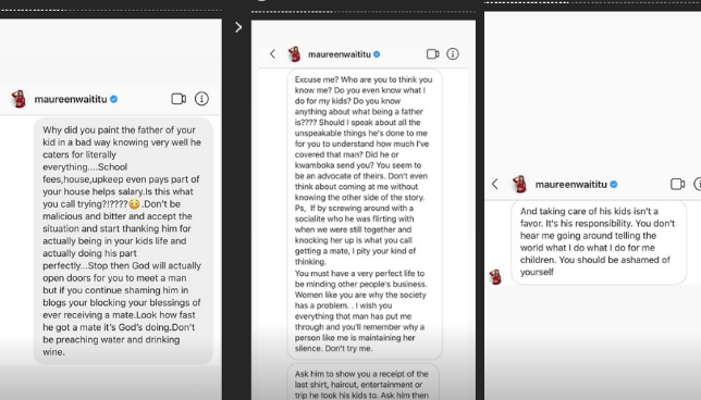 “Ask him to show you a receipt of the last shirt, haircut, entertainment or trip he took his kids. Ask him then you can come here and attack me. And taking care of his kids isn’t a favour. It’s his responsibility . You don’t hear me going around telling the world what I do for me children. You should be ashamed of yourself,” reads Maureen Waititu’s reply that was made public by Blogger Edga Obare.