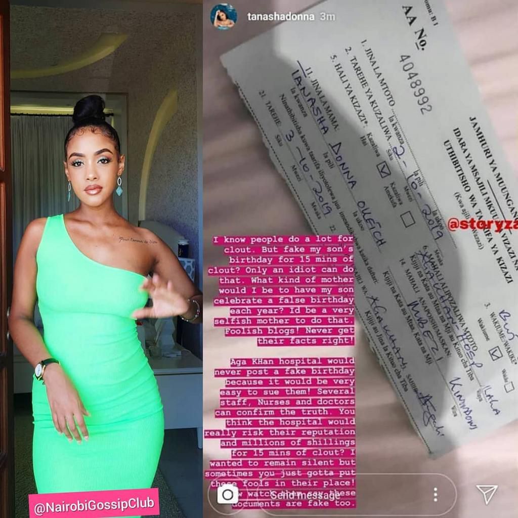 "Aga Khan Hospital would never post a fake Birthday because it would be very easy to sue them. Several staff, nurses and doctors can confirm the truth. You think the hospital would really risk their reputations and millions of shillings for 15 minutes of Clout? I wanted to remain silent but sometimes you just gotta put these fools in their place. Watch out they will say these documents are fake too” said Tanasha Donna.