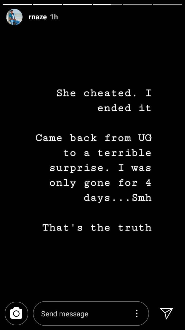 “I have never posted my private life on social media, but let me say this only once to set the record straight for those who were invested. She cheated. I ended it. Came back from UG to a terrible surprise. I was only gone for 4 days...smh. That’s the truth. My heart goes out to all the #BonnieandClyde fans who were invested. I am truly sorry. But life goes on sometimes you swing and miss,” wrote Rnaze.