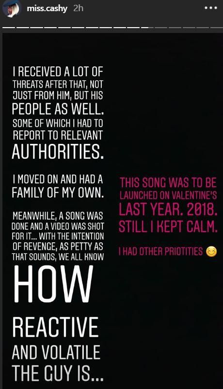 “I received a lot of threats after that, not just from him, but his people as well. Some of which I had to report to relevant authorities. I moved on and had a family of my own. Meanwhile, a song was done and a video was shot for it… with the intention of revenge, as petty as that sounds, we all know how reactive and volatile the guy is… later I’ll talk about how I was constantly discouraged from studying and working.. and why that is a poor decision for any girl to make. Doesn’t matter if you’re dating the president of the world. Girls, get educated and get your own bag,” wrote Miss Cashy.