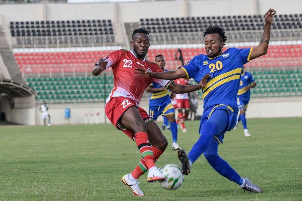 Kenya's Abdalla Hassan (L) fights for the ball with Rwanda's Nshuti Dominique Savio (R) during the FIFA World Cup Qatar 2022 qualifying round group E football match between Kenyan and Rwanda at the Nyayo national stadium in Nairobi on November 15, 2021. (Photo by SIMON MAINA/AFP via Getty Images)