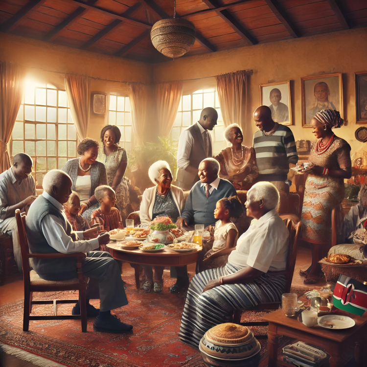 An AI-generated image of elderly Kenyan parents spending time with other family members in a warm and inviting home setting