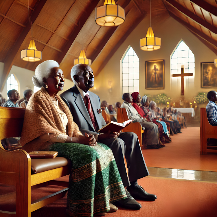 An AI-generated image of elderly Kenyan parents attending a church service The scene is set inside a modern church with a warm, welcoming atmosphere