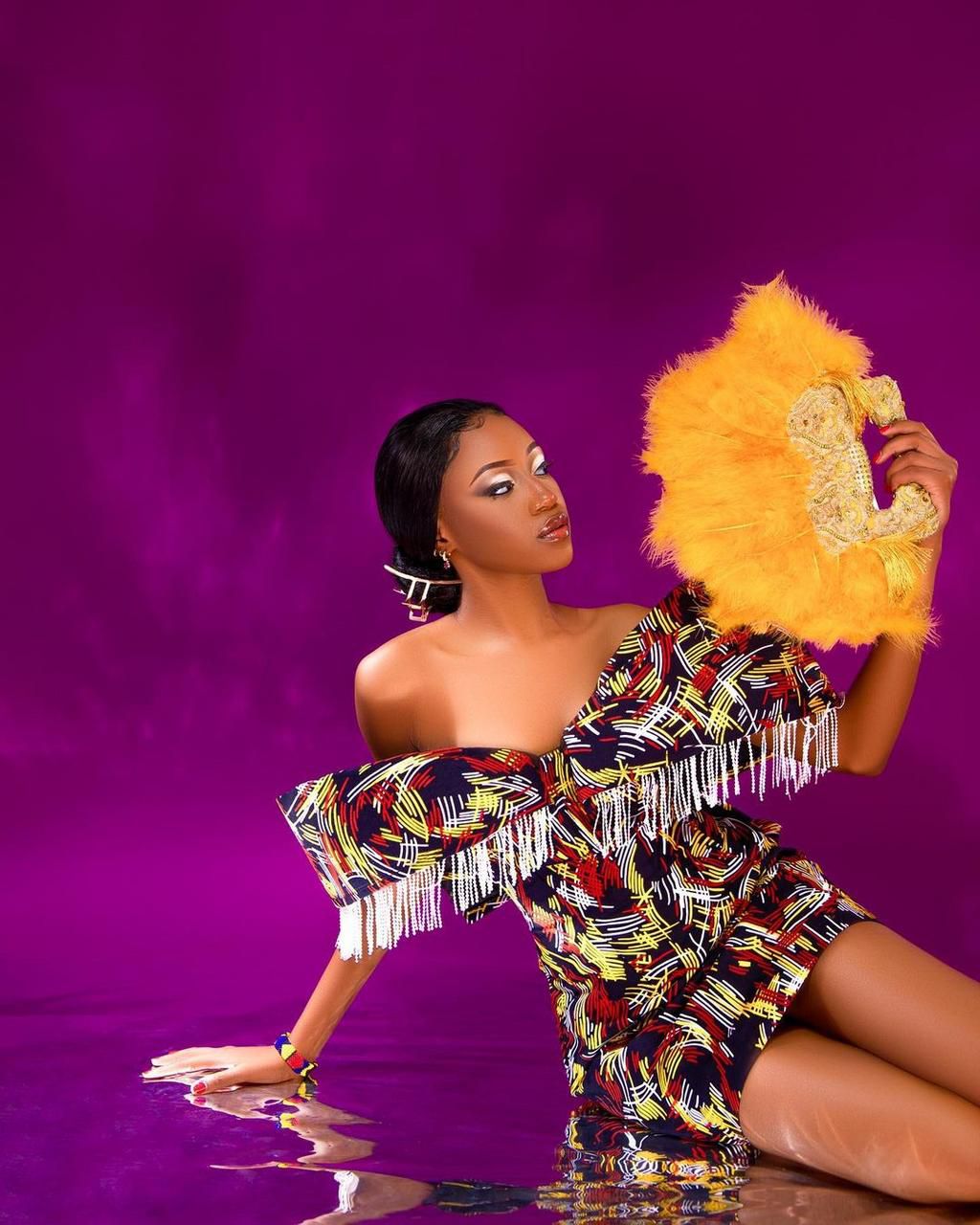 In the photo below, Kayet is seen donning a vibrant off-shoulder dress adorned with intricate patterns and fringe details.