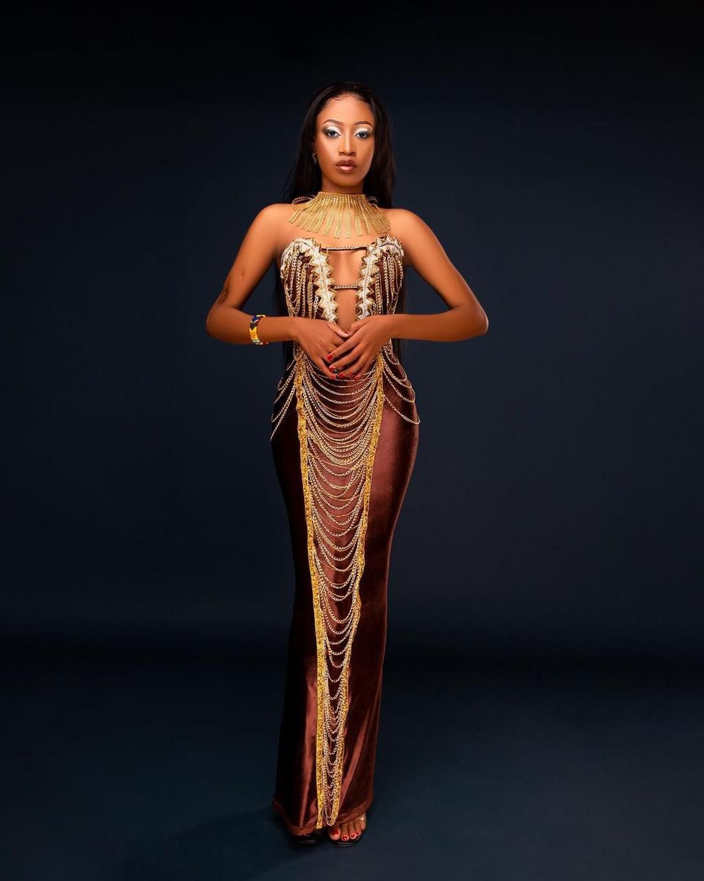 The gown’s design, with its intricate chain details and luxurious fabric, is ideal for formal events or high-end photo shoots. Kayet’s poised stance and minimalistic jewellery allow the dress to be the focal point.