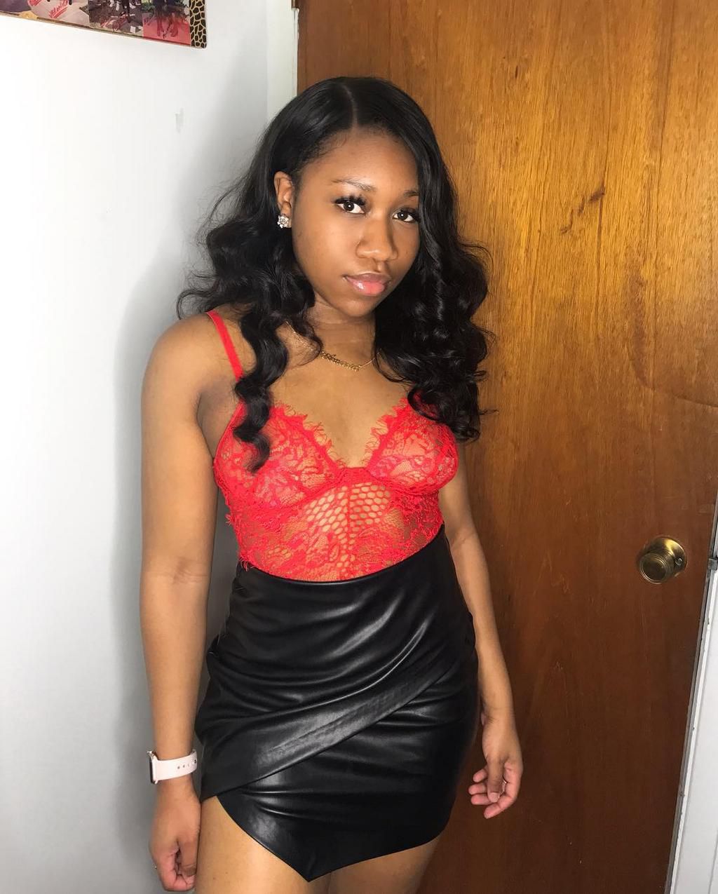 Red bodysuit paired with a black faux leather skirt (Instagram amariaruthh)