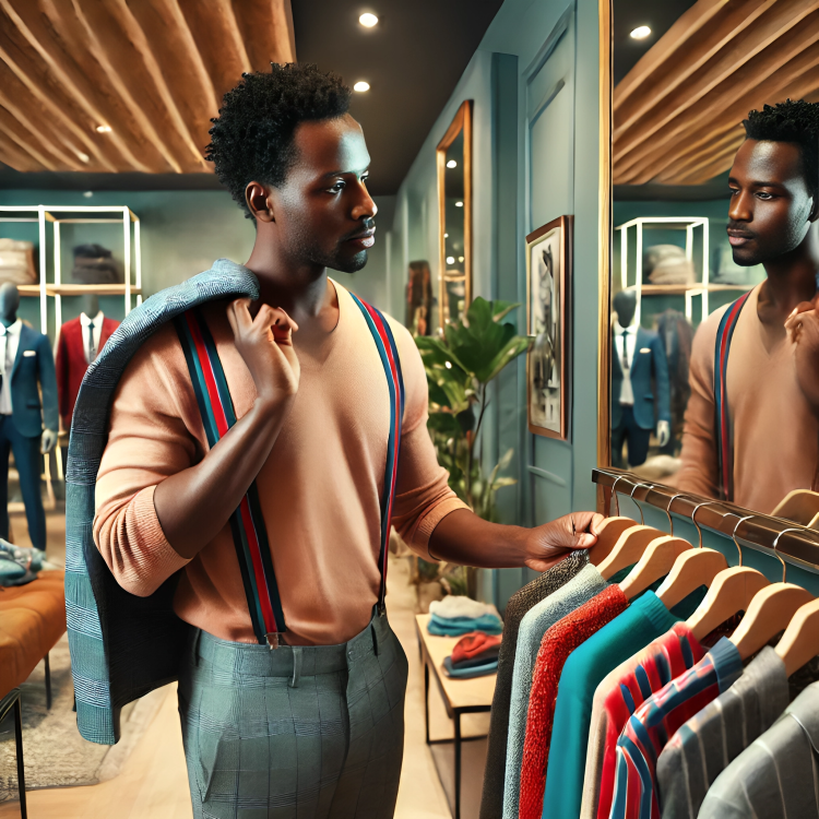 An AI-generated image of a Kenyan man in his mid-30s trying out new clothes in a modern clothing store