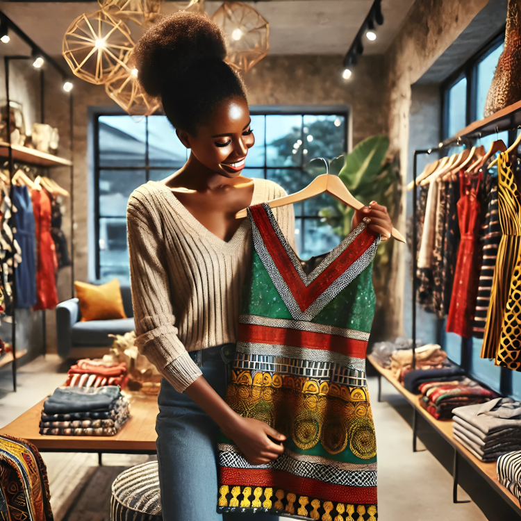 An AI-generated image of a Kenyan woman in her early 30s trying out new clothes in a fashionable boutique She is holding a vibrant, patterned dress in front of her body, look